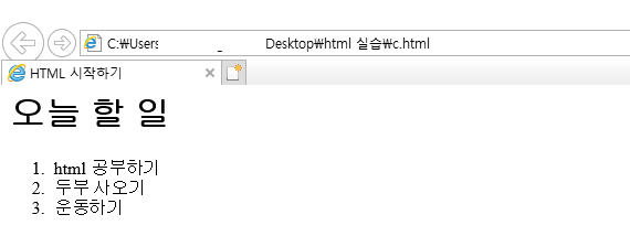 순서가 있는 리스트에 그룹핑을 할 때는 <ol> 태그를 사용하면 앞의 ●대신 숫자가 나오는 것을 확인할 수 있다.